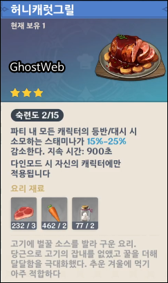 허니캐럿그릴 (짐승고기 3, 당근 2, 설탕 2) 파티 내 모든 캐릭터의 등반/대시 시 소모하는 스태미나 15%~25% 감소. 지속 시간 : 900초 다인모드 시 자신의 캐릭터에만 적용. |