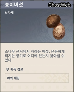 버섯 획득 경로 : 야외 채집 판매 : 리월항 만민당 묘 사부 음식 : 버섯 닭꼬치, 버섯피자, 경책 가정식, 고기죽순데침, 산미 울면 채집 위치 정리 : https://ghostweb.tistory.com/1119 |