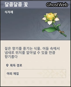달콤달콤 꽃 획득 경로 : 야외 채집 요리/식자재 : 달콤달콤 닭고기 스튜 |