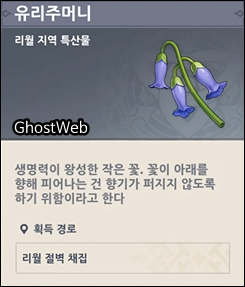 유리주머니 (리월 지역 특산물) 획득 경로 : 리월 절벽 채집 요리 : 삶은 검정 농어, 바위항 지삼선 채집 위치 정리 : https://ghostweb.tistory.com/1142 |