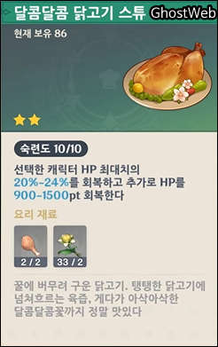 달콤달콤 닭고기 스튜 (새고기2, 달콤달콤 꽃 2) 선택한 캐릭터 HP 최대치의 20%~24%를 회복 추가로 HP를 900~1500pt 회복 |
