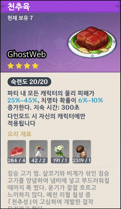 천추육 (짐승고기 4, 설탕 2, 청심 1, 송이버섯 1) 파티 내 모든 캐릭터의 물리 피해가 25%~45% 증가. 치명타 확률이 6%~10% 증가. 지속 시간 : 300초 다인모드 시 자신의 캐릭터에만 적용. |