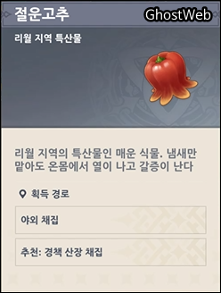 절운고추 획득 경로 : 야외 채집, 경책 산장 채집 판매 : 리월항 만민당 묘 사부 요리 : 삶은 검정 농어, 허브냉채, 경책 가정식, 절운 누룽지, 절운고추 치킨, 허브 고기말이 채집 위치 정리 : https://ghostweb.tistory.com/1136 |