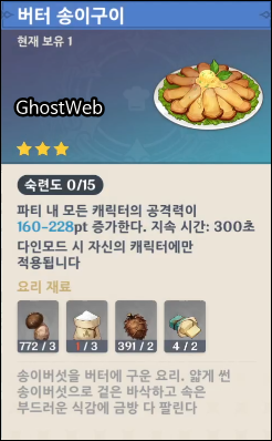 버터 송이구이 (송이버섯 3, 밀가루 3, 솔방울 2, 버터 2) 파티 내 모든 캐릭터의 공격력이 160~228pt 증가. 지속 시간 : 300초 다인모드 시 자신의 캐릭터에만 적용. 레시피 구매 : 몬드성 디어 헌터 사라 (4500 모라) |