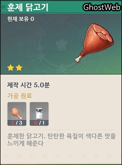훈제 닭고기 획득 경로 : 요리 가공 획득 (새고기 3, 소금 1) 요리/삭자재 : - |