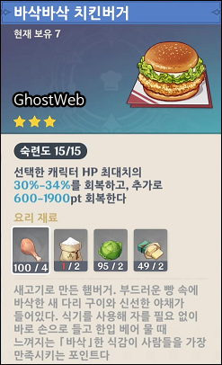 바삭바삭 치킨버거 (새고기 4, 밀가루 2, 양배추 2, 버터 2) 선택한 캐릭터 HP 최대치의 30%~34%를 회복. 추가로 600~1900pt 회복. |