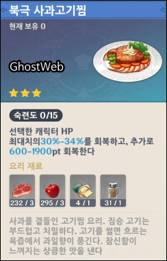 북극 사과고기찜 (짐승고기 3, 사과 3, 버터 1, 후추 1) 선택한 캐릭터 HP 최대치의 30%~34%를 회복. 추가로 600~1900pt 회복. |