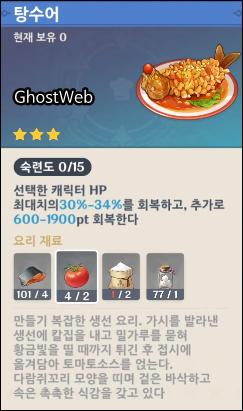 탕수어 (생선 살코기 4, 토마토 2, 밀가루 2, 설탕 1) 선택한 캐릭터 HP 최대치의 30%~34%를 회복. 추가로 600~1900pt 회복. 레시피 구매 : 리월항 만민당 묘 사부 (4500 모라) |
