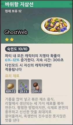 바위항 지삼선 (감자 2, 유리주머니 1, 송이버섯 1) 파티 내 모든 캐릭터의 치명타 확률이 6%~12% 증가. 지속 시간 : 300초 다인모드 시 자신의 캐릭터에만 적용. 레시피 구매 : 리월항 유리정 리채 (2500 모라) |