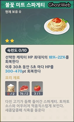 불꽃 미트 스파게티 (밀가루 2, 짐승 고기 2, 토마토 1) 선택한 캐릭터 HP 최대치의 18%~22%를 회복 이후 30초 동안 5초 마다 HP를 300~470pt 회복 레시피 구매 : 몬드성 디어 헌터 사라 (2250 모라) |