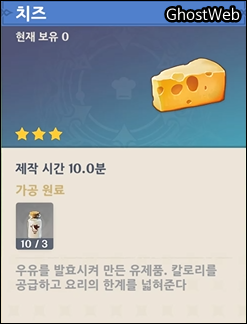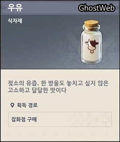우유 획득 경로 : 잡화점 구매 (몬드 잡화점 블랑키, 리월항 영발 상점 동승) 식자재 : 크림, 버터, 치즈 음식 : 행인두부, 어부 토스트 |