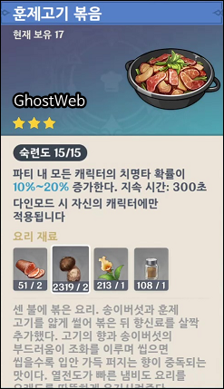 훈제고기 볶음 (햄 2, 송이버섯 2, 금어초 1, 후추 1) 파티 내 모든 캐릭터의 치명타 확률이 10%~20% 증가. 지속 시간 : 300초 다인모드 시 자신의 캐릭터에만 적용. 레시피 구매 : 리월항 유리정 리채 (5000 모라) |