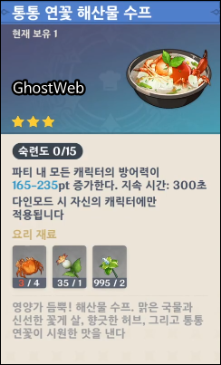 통통 연꽃 해산물 수프 (꽃게 4, 통통 연꽃 1, 허브 2) 파티 내 모든 캐릭터의 방어력이 165~235pt 증가. 지속 시간 : 300초 다인모드 시 자신의 캐릭터에만 적용. 레시피 구매 : 몬드성 디어 헌터 사라 (4500 모라) |