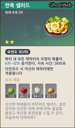 만족 샐러드 (양배추 2, 사과 2, 새알 1, 감자 1) 파티 내 모든 캐릭터의 치명타 확률이 6%~12% 증가 지속 시간 : 300초 다인 모드 시 자신의 캐릭터에만 적용 |