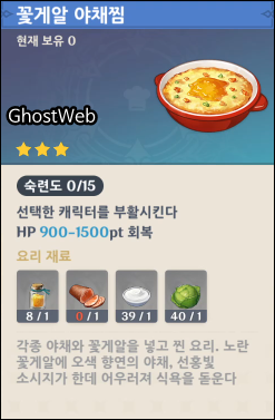 꽃게알 야채찜 (꽃게알 1, 햄 1, 크림 1, 양배추 1) 선택한 캐릭터를 부활시킨다. HP 900~1500pt 회복 |