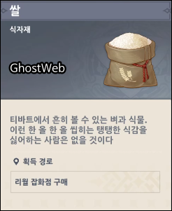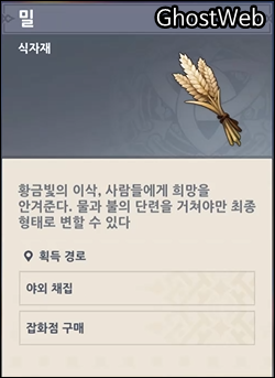 밀 획득 경로 : 야외 채집, 잡화점 구매 (몬드 잡화점 블랑키, 리월항 영발 상점 동승) |