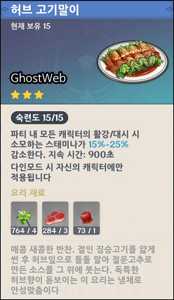 허브 고기말이 (허브 4, 짐승고기 3, 절운고추 1) 파티 내 모든 캐릭터의 활강/대시 시 소모하는 스태미나 15%~25% 감소. 지속 시간 : 900초 다인모드 시 자신의 캐릭터에만 적용. 레시피 구매 : 리월항 만민당 묘 사부 (4500 모라) |