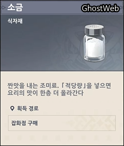 소금 획득 경로 : 잡화점 구매 (몬드 잡화점 블랑키, 리월항 영발 상점 동승) 식자재 : 훈제 닭고기, 햄, 베이컨 음식 : 삶은 검정 농어, 버터 생선 구이, 골든크랩, 중원 내장꼬치 |