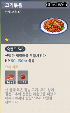 고기볶음 (짐승 고기 1, 절운 고추1) 선택한 캐릭터를 부활 HP 50~150pt 회복 |