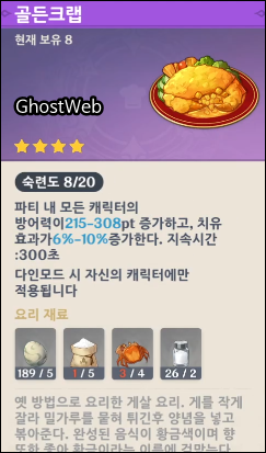 골든크랩 (새알 5, 밀가루 5, 꽃게 4, 소금 2) 파티 내 모든 캐릭터의 방어력이 215~308pt 증가. 치유 효과가 6%~10% 증가. 지속 시간 : 300초 다인모드 시 자신의 캐릭터에만 적용. |