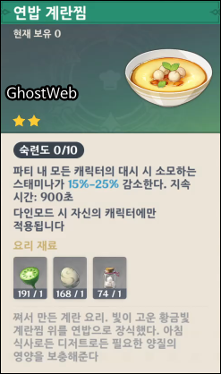 연밥 계란찜 (연꽃받침1, 새알 1, 설탕1) 파티 내 모든 캐릭터의 대시 시 소모하는 스태미나 15%~25% 감소 지속 시간 : 900초 다인모드 시 자신의 캐릭터에만 적용 |