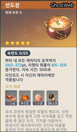 선도장 (햄 4, 꽃게 3, 생새우살 3, 송이버섯 3) 파티 내 모든 캐릭터의 공격력이 260~372pt 치명타 확률이 8%~12% 증가 지속 시간 : 300초 다인모드 시 자신의 캐릭터에만 적용 |