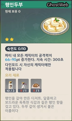 행인두부 (우유 3, 설탕 1, 행인 1) 파티 내 모든 캐릭터의 공격력이 66~95pt 증가 지속 시간 : 300초 다인모드 시 자신의 캐릭터에만 적용 |