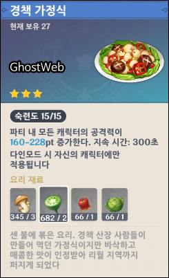 경책 가정식 (버섯 3, 연꽃받침 2, 절운고추 1, 양배추 1) 파티 내 모든 캐릭터의 공격력이 160%~228% 증가. 지속 시간 : 300초 다인모드 시 자신의 캐릭터에만 적용. 레시피 구매 : 경책 산장 소백 (5000 모라) |