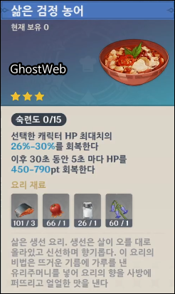 삶은 검정 농어 (생선 살코기 3, 절운고추 1, 소금 1, 유리주머니 1) 선택한 캐릭터 HP 최대치의 26%~30% 회복. 이후 30초 동안 5초 마다 HP를 450~790pt 회복. 레시피 구매 : 리월항 만민당 묘 사부 (4500 모라) |