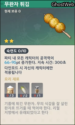 무완자 튀김 (밀가루 3, 흰 무 2, 후추 1) 파티 내의 모든 캐릭터의 공격력이 66~95pt 증가 지속 시간 : 300초 다인 모드 시 자신의 캐릭터에만 적용 |