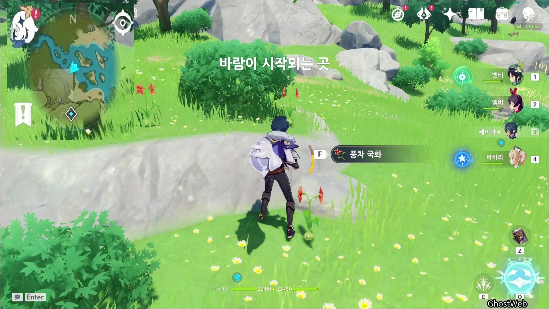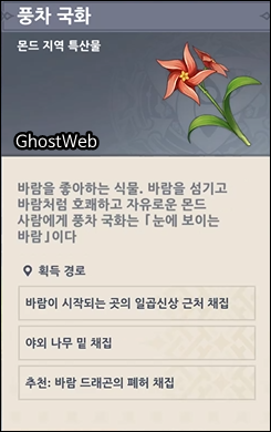 풍차 국화는 몬드 성 5시 방향에 있는 <바람이 시작되는 곳 일곱신상 근처>, <바람 드래곤의 폐허>에서 발견할 수 있어요.