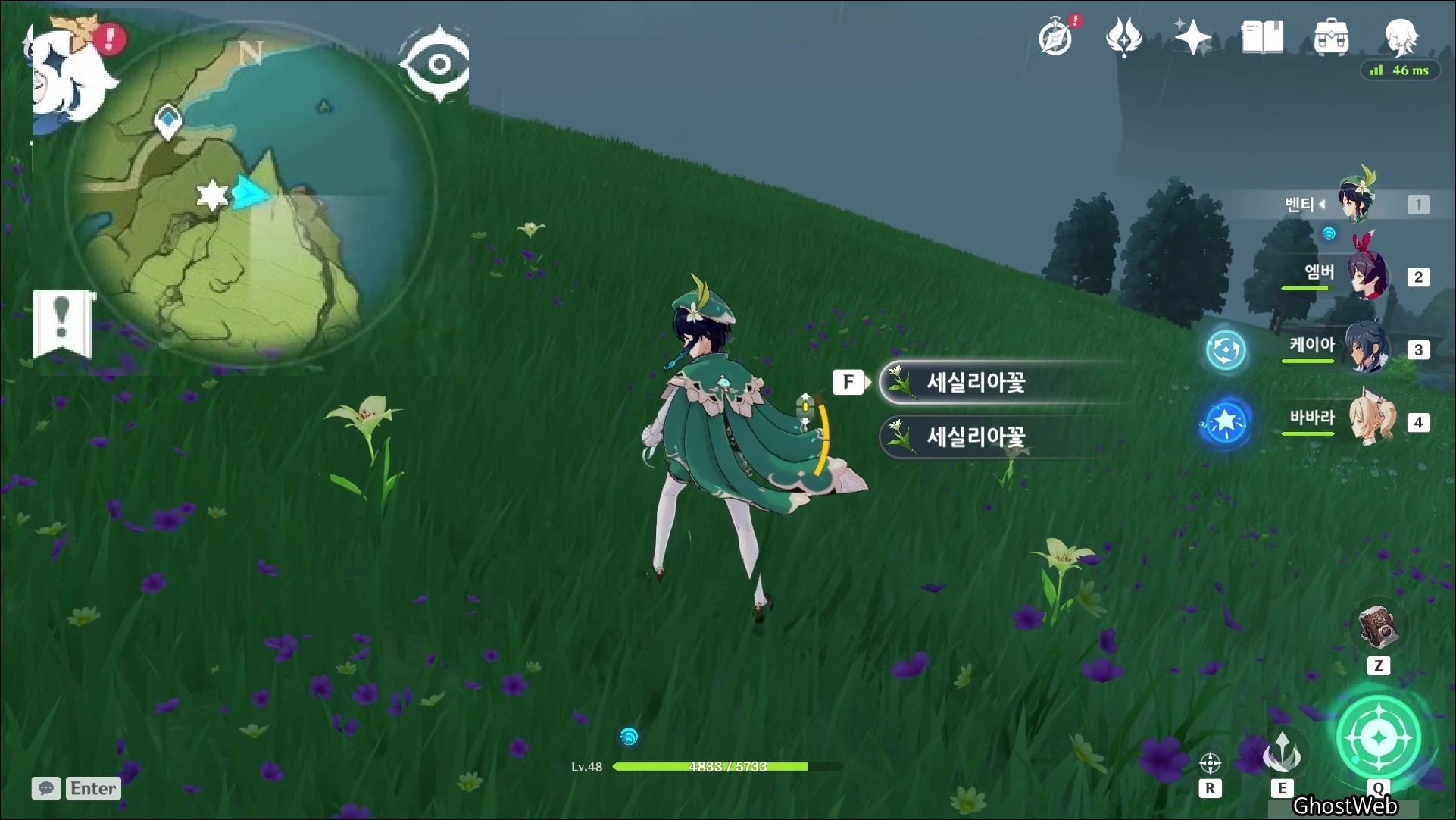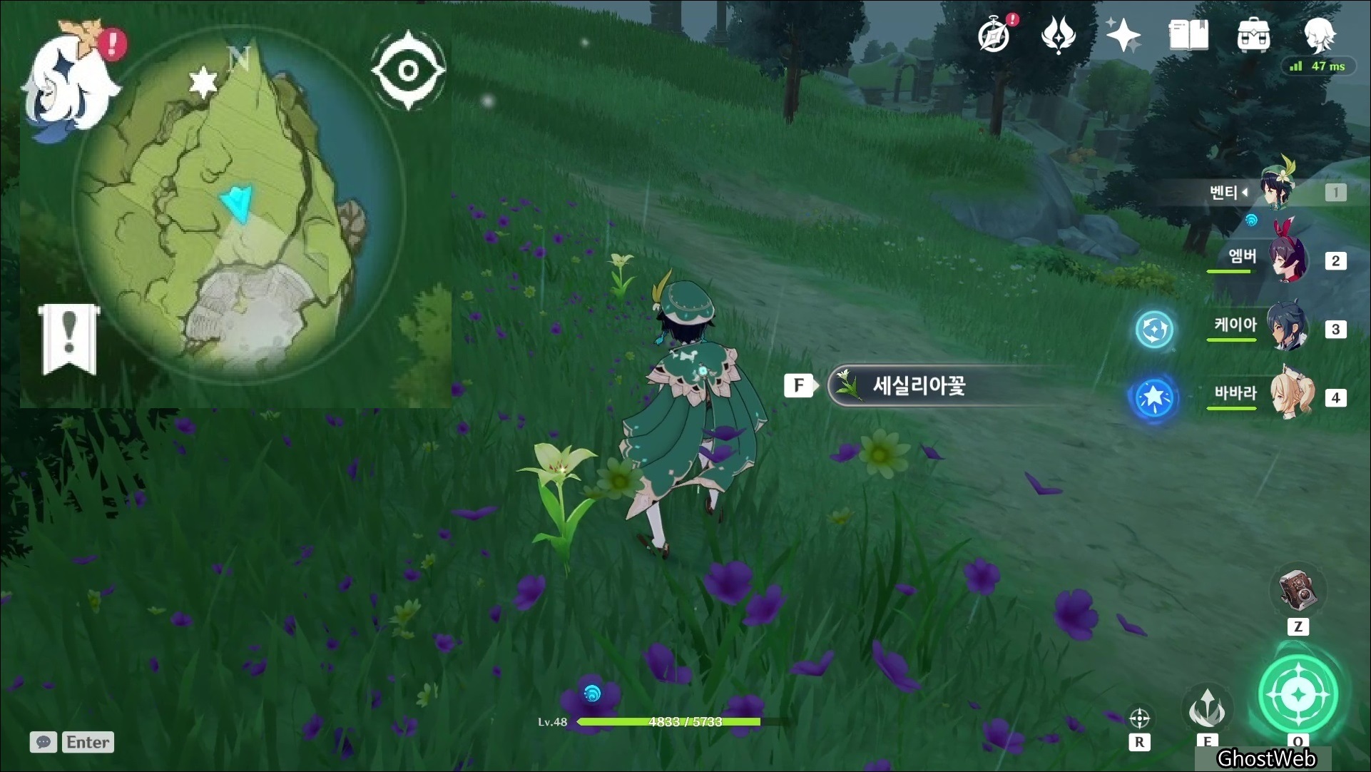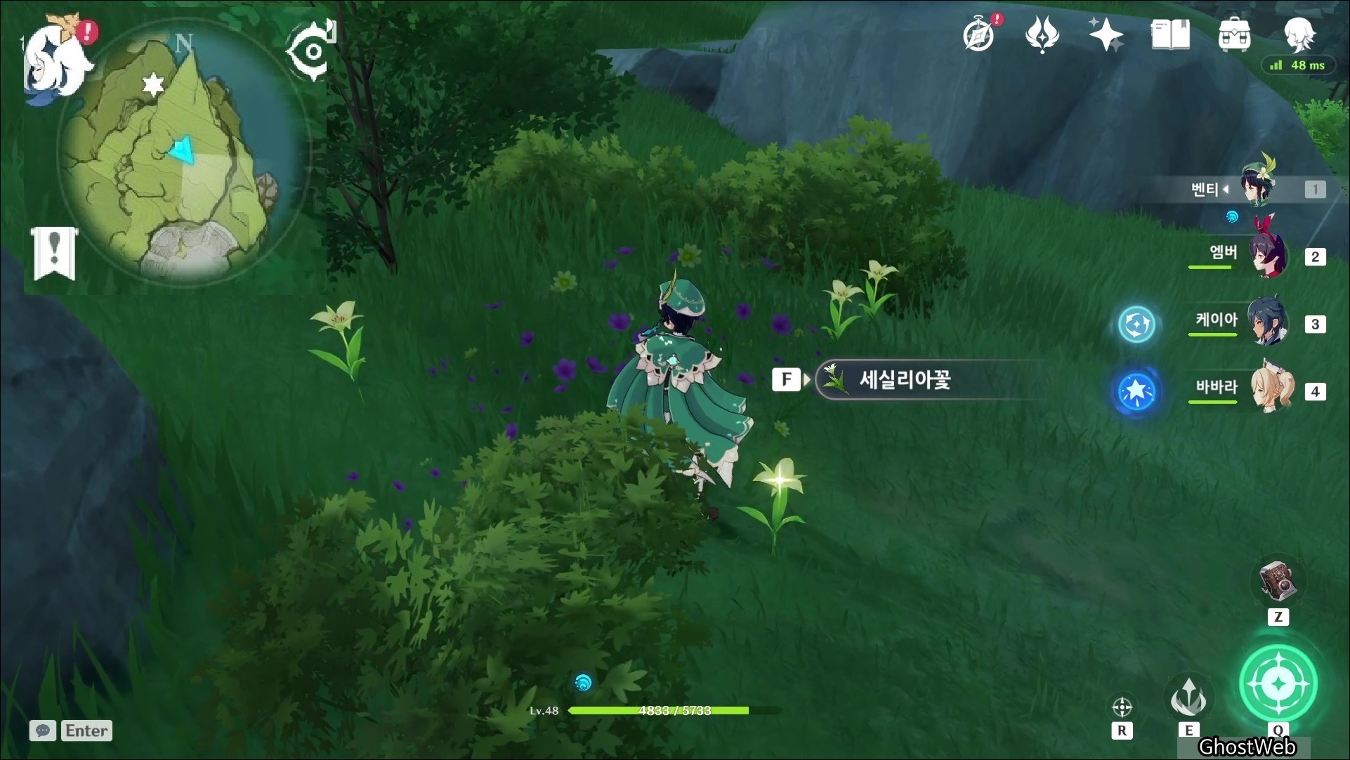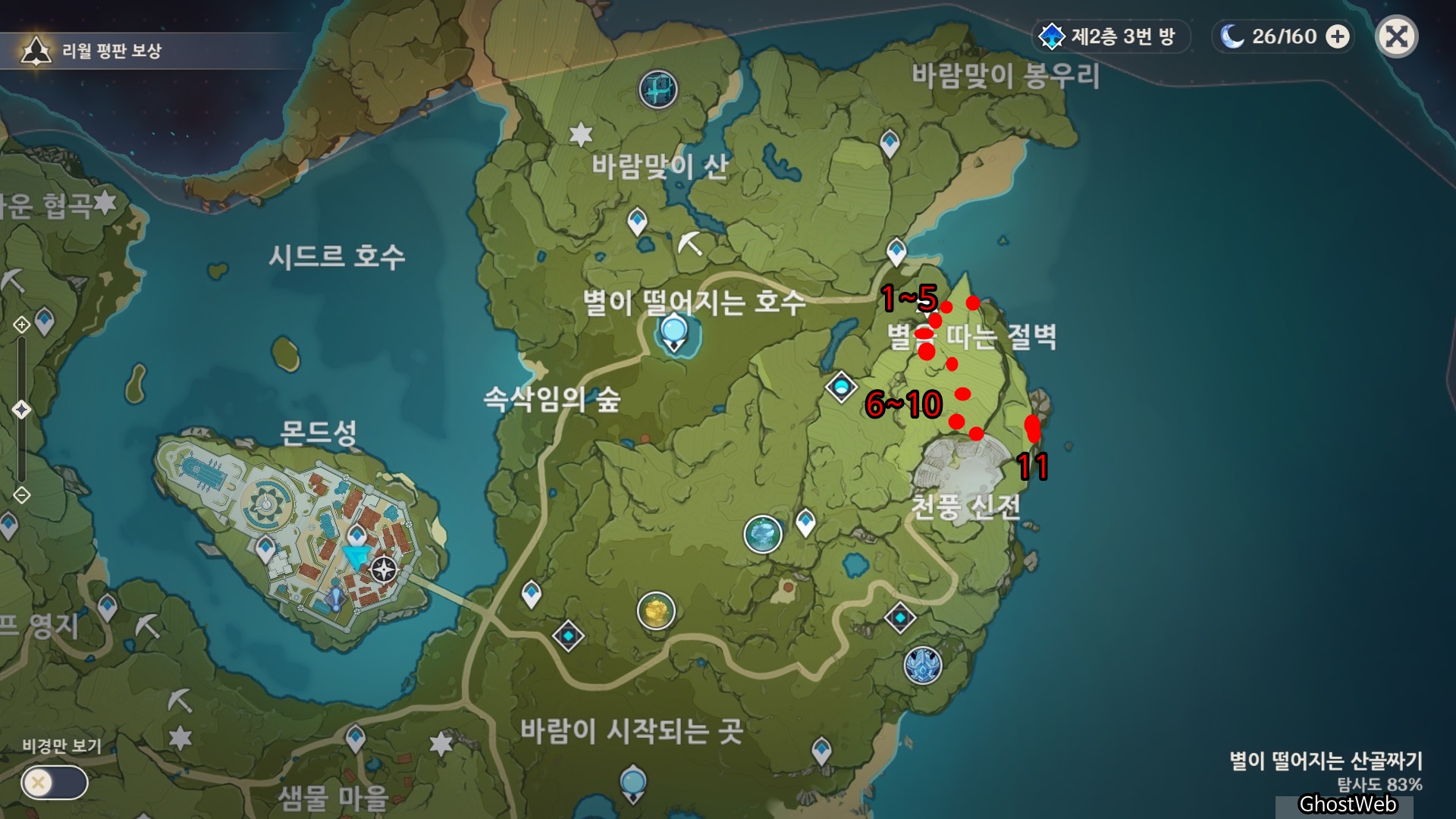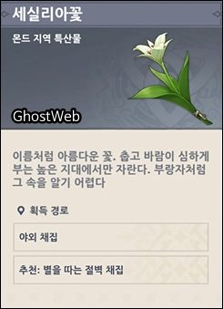 세실리아꽃은 몬드성 기준 2시 방향에 있는 <병을 따는 절벽>에 주로 분포해있어요.