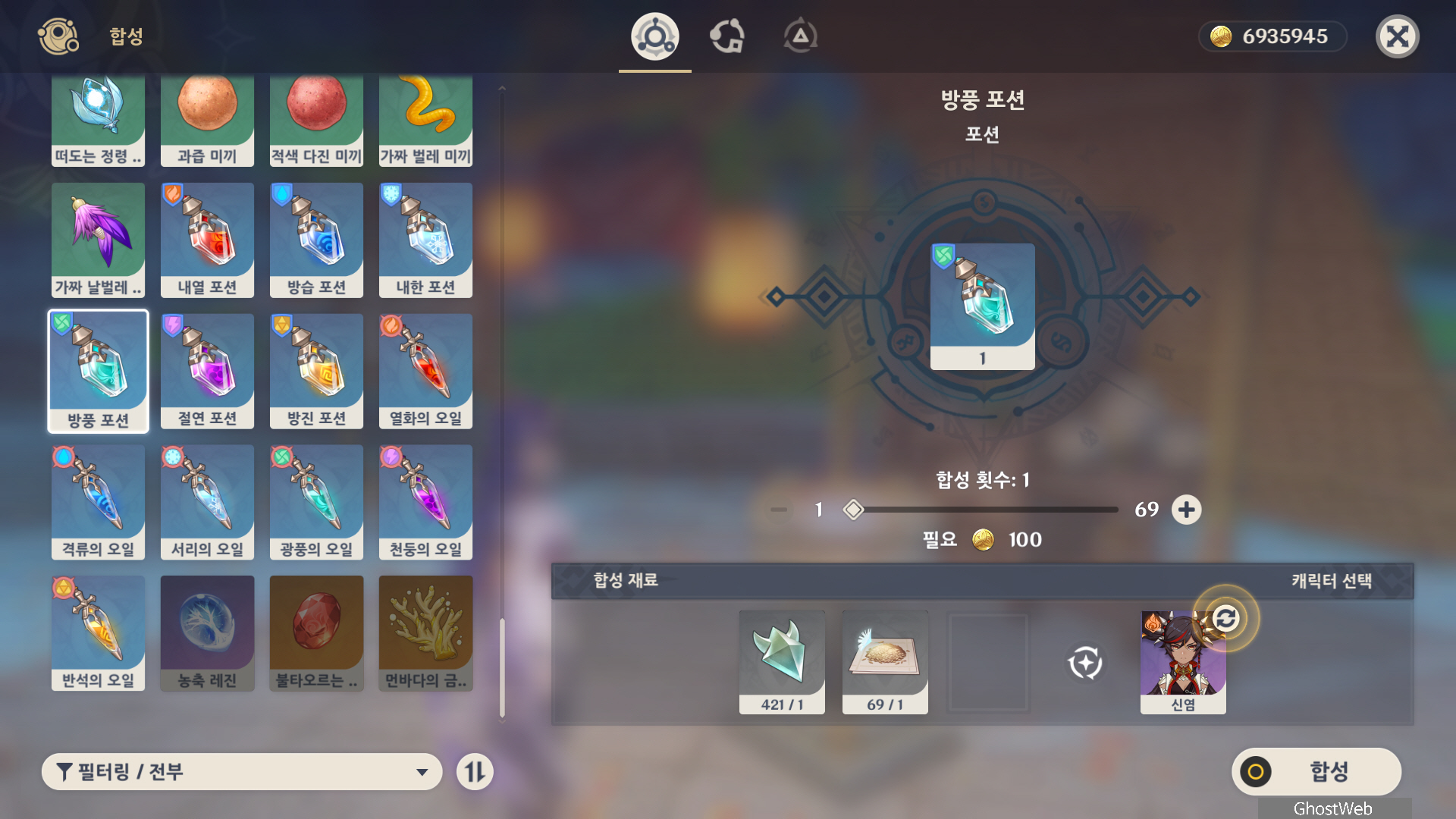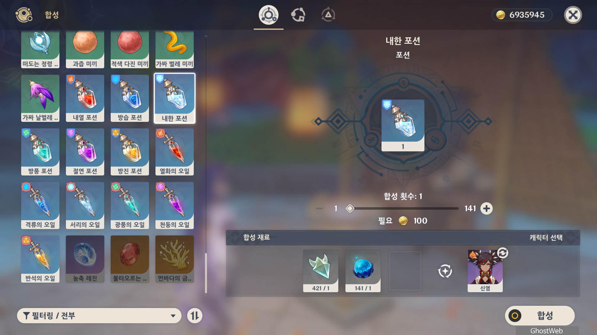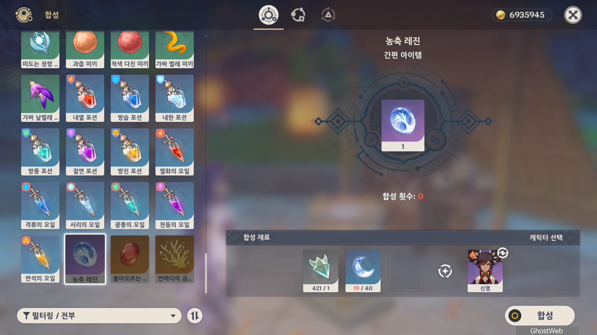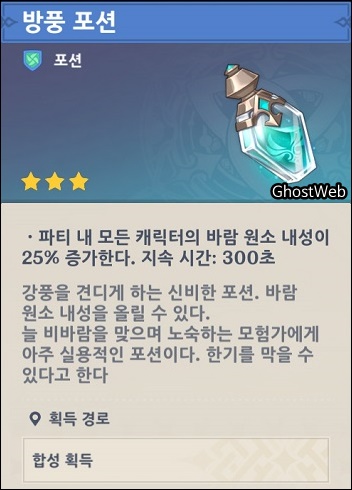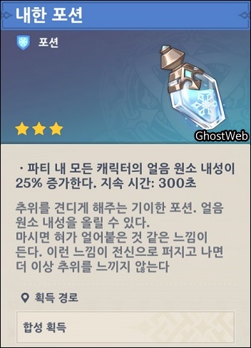 합성대에서 수정 코어를 재료로 하여 내한 포션, 방풍 포션, 농축 레진을 만들 수 있어요.