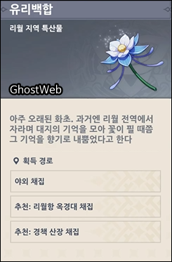 유리백합은 <리월항 옥경대>, <경책 산장>에서 얻을 수 있어요.