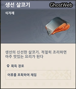 생선 살코기는 강가에 있는 물고기를 채집하면 얻을 수 있는데, 리월항의 옥경대에 있는 연못에서 물고기를 쉽게 잡을 수 있으니 참고하세요.