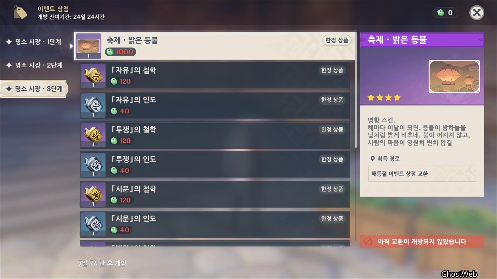 - 동행의 등불 (옥 장신구 1000개로 4성 캐릭터 교환, 1번만 가능)