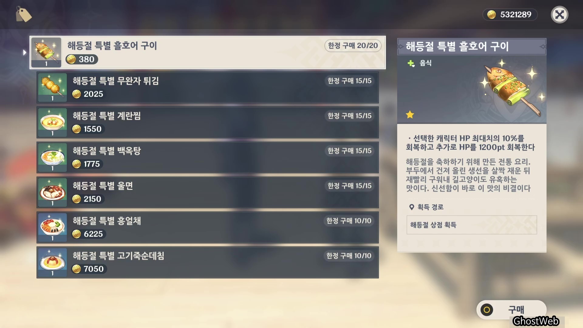 - 해등절 특별 흘호어 구이 (380 모라, 한정 구매 20)