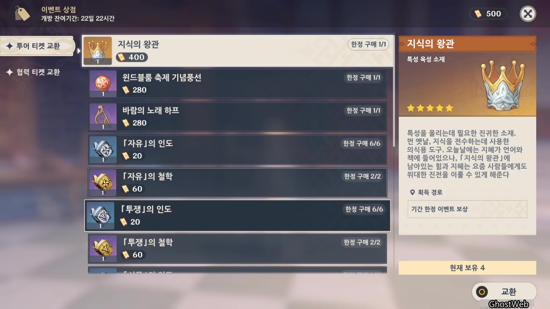 - 지식의 왕관 (400, 특성 육성 소재)