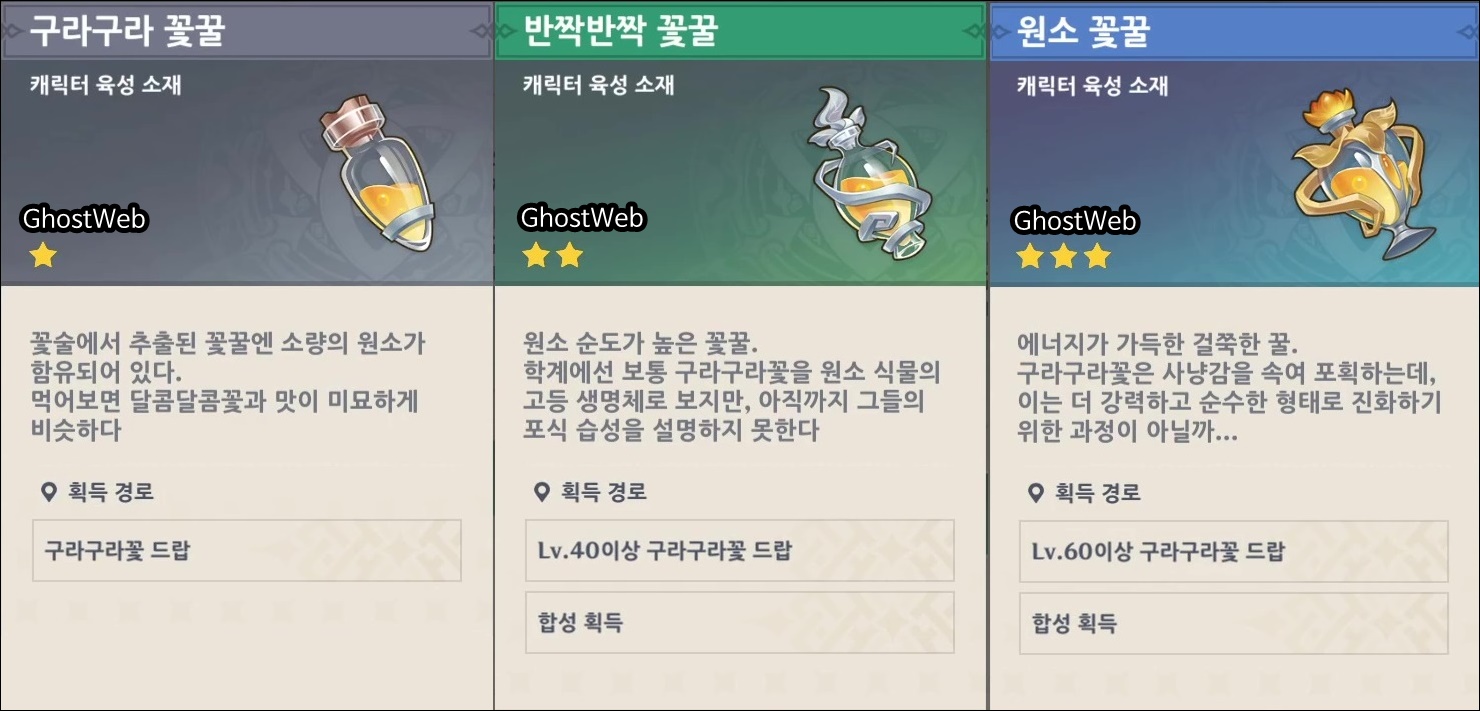 이번에는 캐릭터 육성 소재인 구라구라/반짝반짝/원소 꽃꿀을 얻을 수 있는 뜨거운, 얼어붙은 구라구라 꽃 위치를 정리해보도록 할게요.