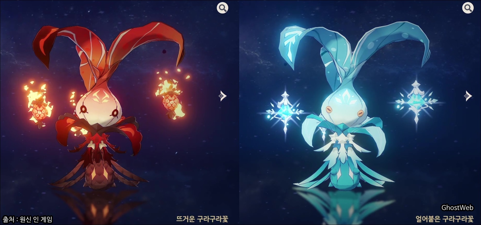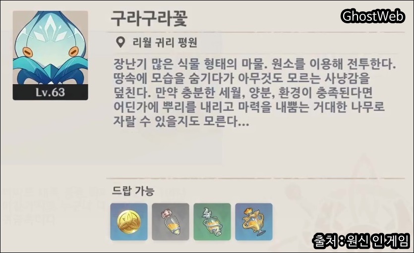 구라구라 꽃은 불 원소 속성인 뜨거운 구라구라꽃, 얼음 원소 속성인 구라구라꽃이 있으며, 리월 지역 많이 있으며, 대부분 1마리씩 있지만, 일부 지역에는 두 마리씩 있는 지역도 있어요.