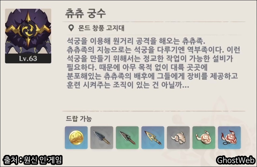 츄츄 궁수는 주로 몬드 지역에 분포되어 있고 다른 싸움군, 샤먼 등과 함께 무리 지어 필드에 있어 다양하고 손 쉽게 캐릭터 육성 소재를 얻을 수 있는 몬스터 중 하나에요.