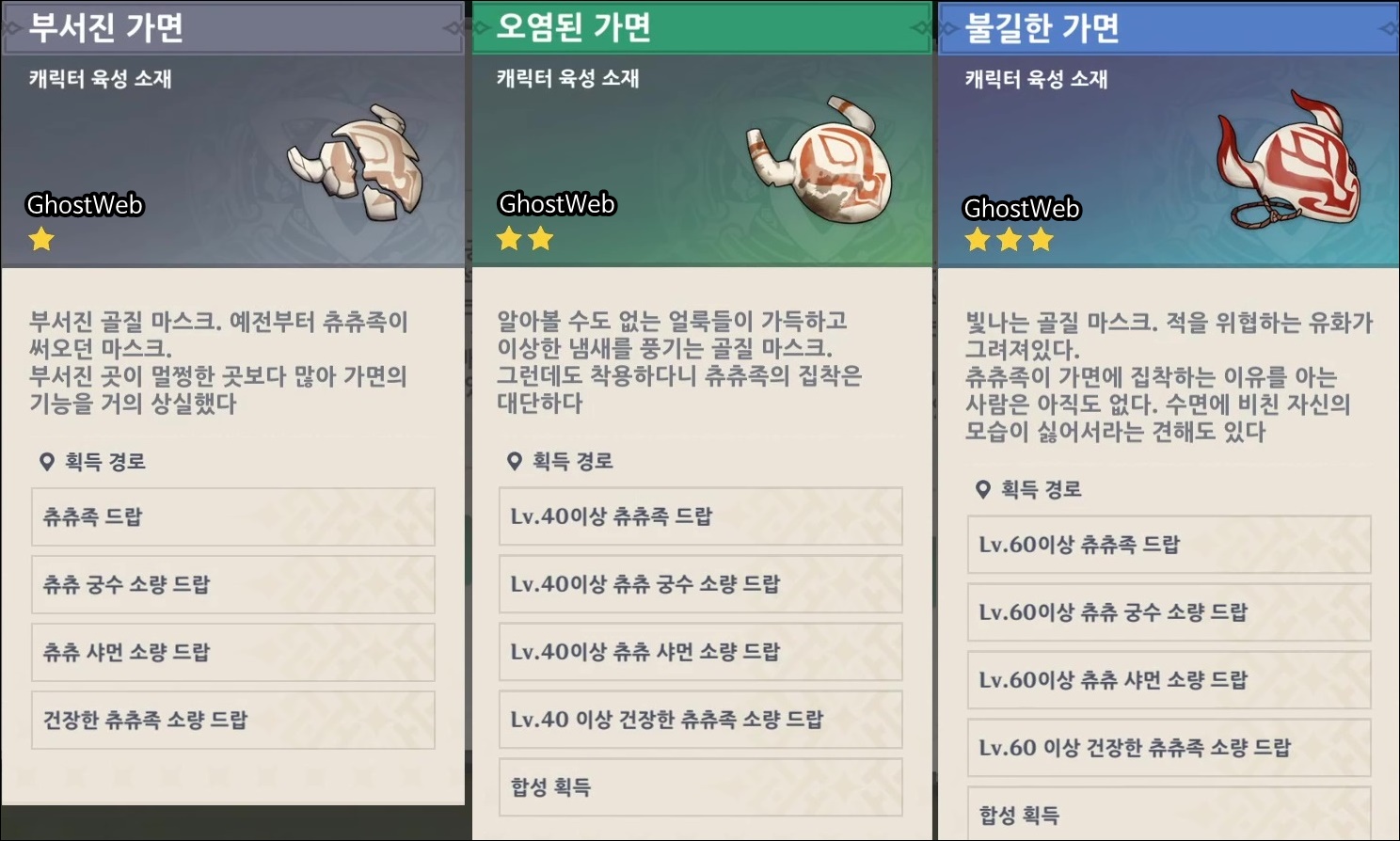 - 불길한 가면 : 레벨 60 이상의 츄츄족, 츄츄족 궁수, 츄츄족 샤먼, 건장한 츄츄족, 합성