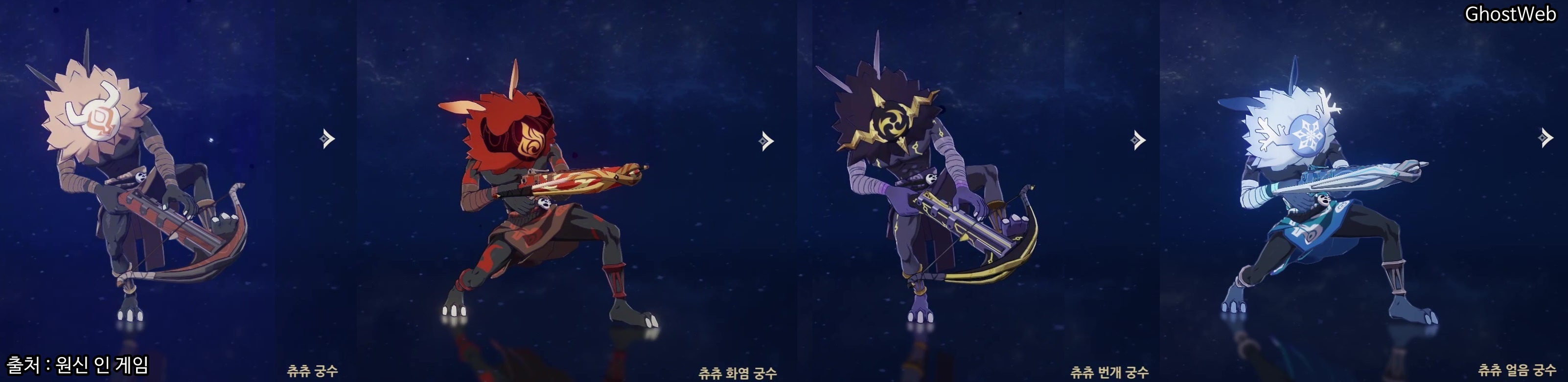 일반, 불, 번개, 얼음 원소의 츄츄 궁수가 있으며, 가끔 심연의 메이지(불, 물, 얼음)와도 같이 있는 경우도 있어요.