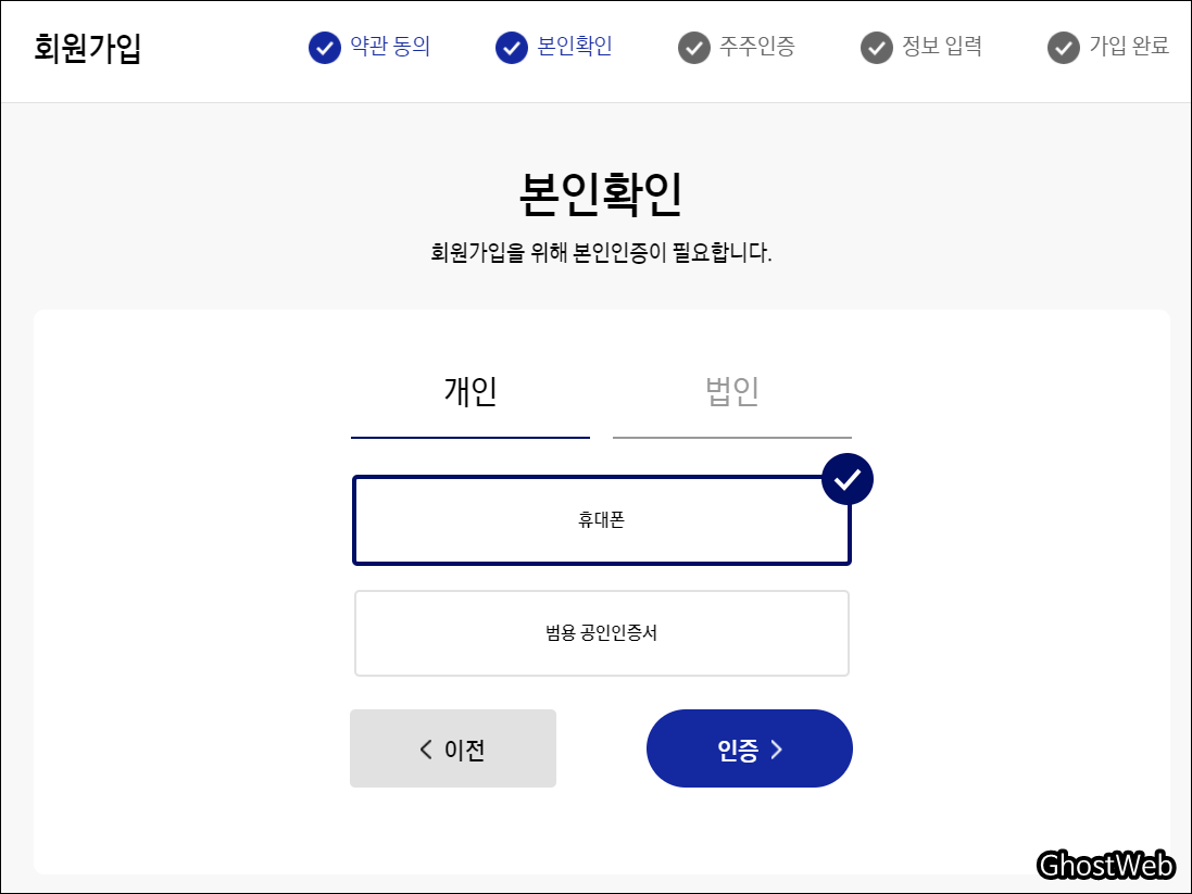 약관 동의 → 본인 확인 → 주주 인증 → 정보 입력 → 가입 완료