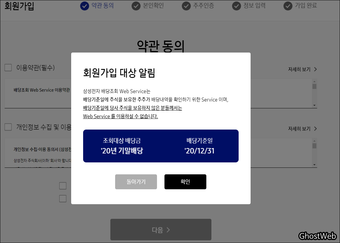 ※ 배당 기준일(20.12.31 / 배당 기준일 20.12.28까지는 주식을 매수)에 삼성전자(보통/우선주) 주식을 보유하지 않는 분은 해당 서비스를 이용할 수 없어요.
