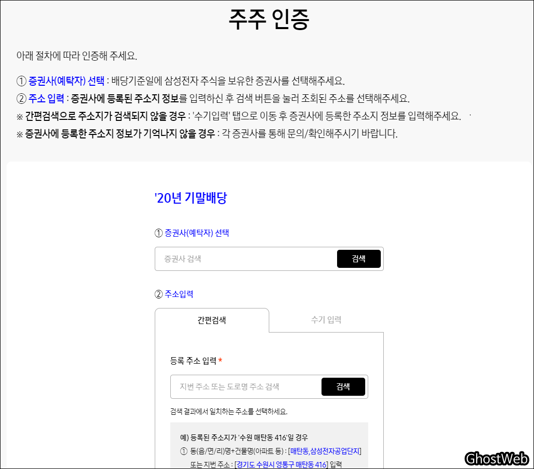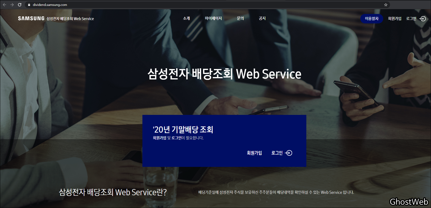 배당금 조회는 <삼성전자 배당조회> 홈페이지에 주주 인증을 통해 회원 가입 후에 조회할 수 있어요.