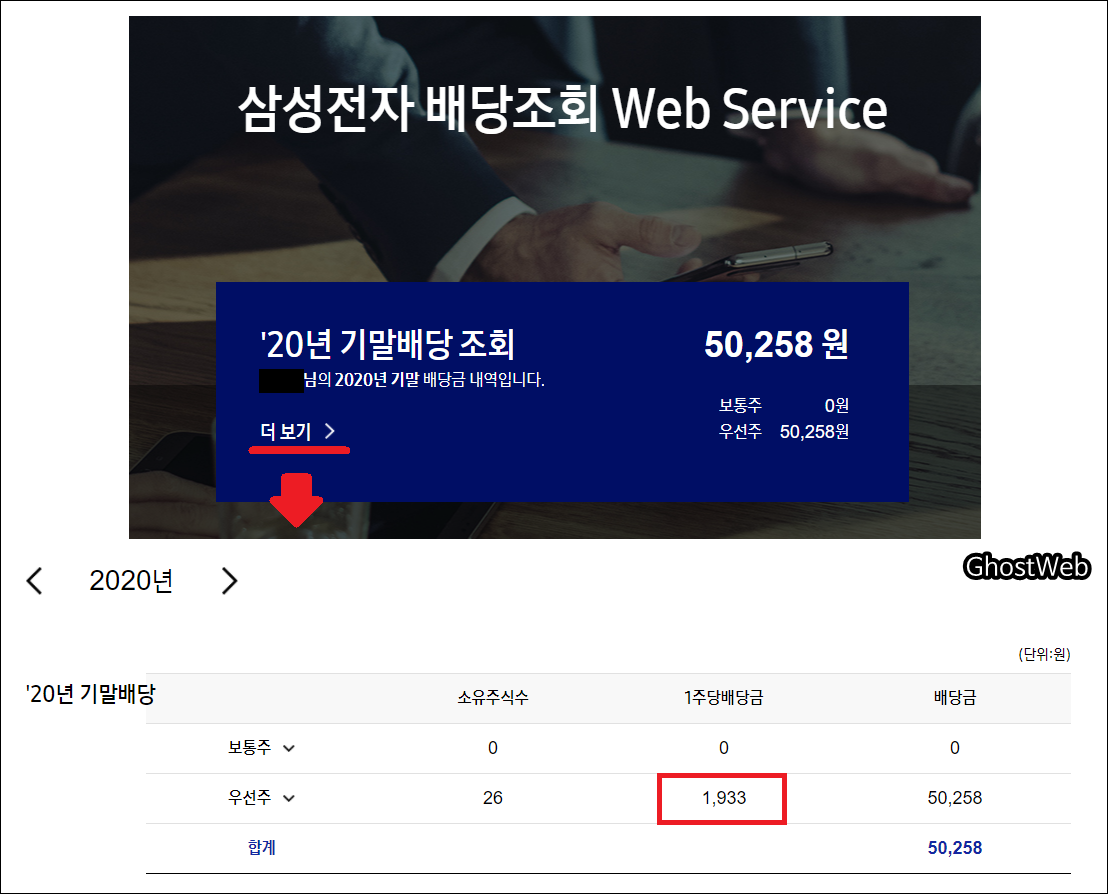보통주, 우선주 둘 다 조회되면 소유 주식수와 1주당 배당금, 총 배당금을 확인할 수 있어요.
