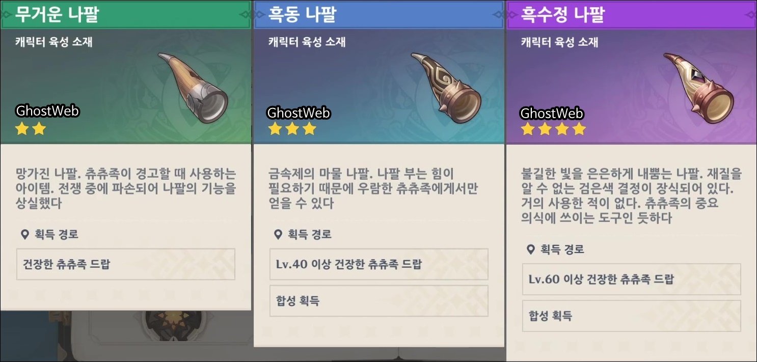 - 흑수정 나팔: 레벨 60 이상의 건장한 츄츄족 드랍, 합성
