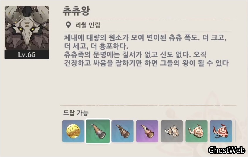 이번에는 캐릭터 육성 소재인 무거운/흑동/흑수정 나팔, 부서진/오염된/불길한 가면을 얻을 수 있는 츄츄왕의 위치를 정리해 볼 게요.