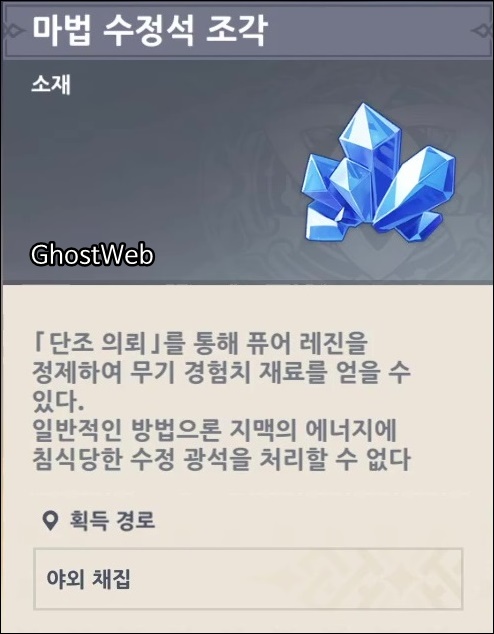이번에는 무기 경험치 재료인 마법 수정석 조각을 얻을 수 있는 위치를 정리해보도록 할게요.